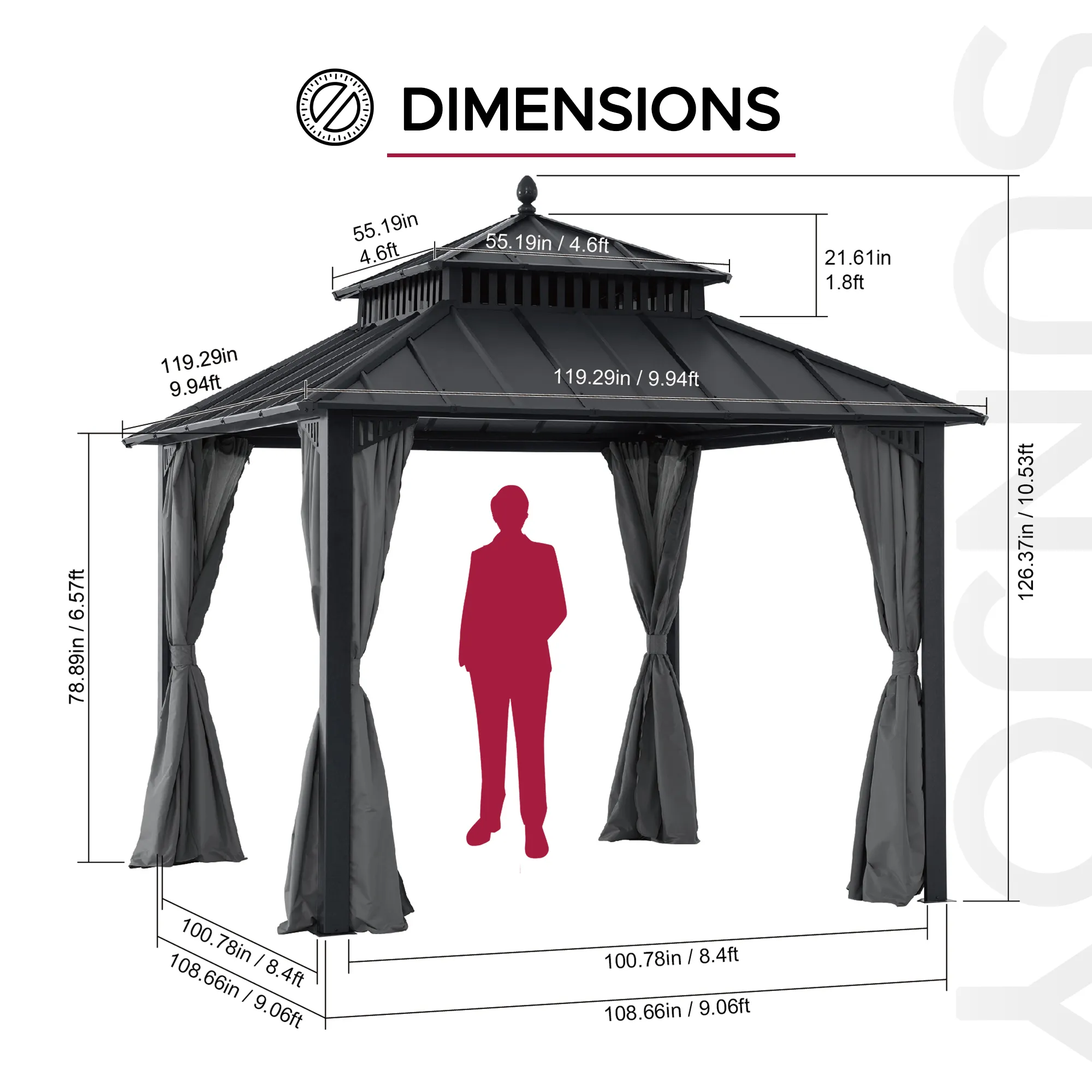 SUNJOY Kingston 10x10 Gazebo with Netting & Curtain | Steel Roof with Extra-Tall & Oversized Vent Top - Gray Aluminum Posts