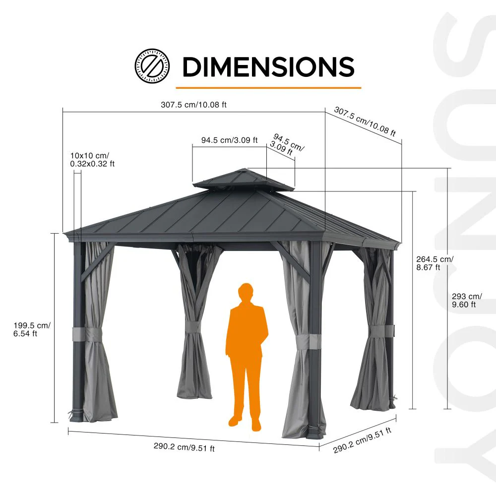 Instantly create an outdoor gathering spot for family and friends away from the glaring sun and pesky insects. This 10 ft. x 10 ft. 2-tier, ventilated hardtop gazebo by the world’s leading ready-to-assemble outdoor structure maker, SUNJOY, creates the perfect outdoor setting for any time of the year. The 2-tier roof provides just the right amount of airflow while keeping occasional inclement weather at bay. Keep cool in the shade under the rust-resistant powder-coated aluminum frame and steel roof gazebo. Use mesh netting to keep mosquitoes and other bugs from joining your party. Set the mood by suspending a chandelier from the incorporated ceiling hook for functional light and high design. With straightforward, easy-to-follow assembly instructions you’ll be relaxing in your favorite new outdoor living space for years to come.