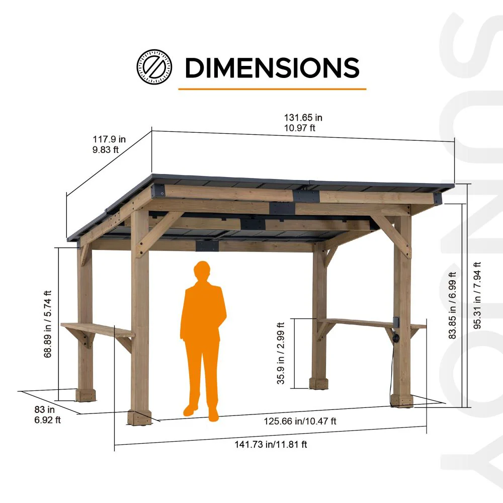Upgrade your outdoor experience with the 10’ x 12’ Cedar Frame Hardtop Grill Gazebo. Crafted with premium cedar frame construction and a durable rust-resistant powder-coated steel roof, this gazebo offers reliable protection from the elements. Featuring two spacious solid wood bar shelves, it's perfect for keeping your refreshments, BBQ essentials, and towels within reach. The exclusive power port includes 2 USB ports and 1 outlet, meeting all your power needs. Say goodbye to clutter with the built-in cord organizer. Plus, assembly is a breeze with straightforward instructions, ensuring you'll enjoy your new outdoor oasis for years to come.