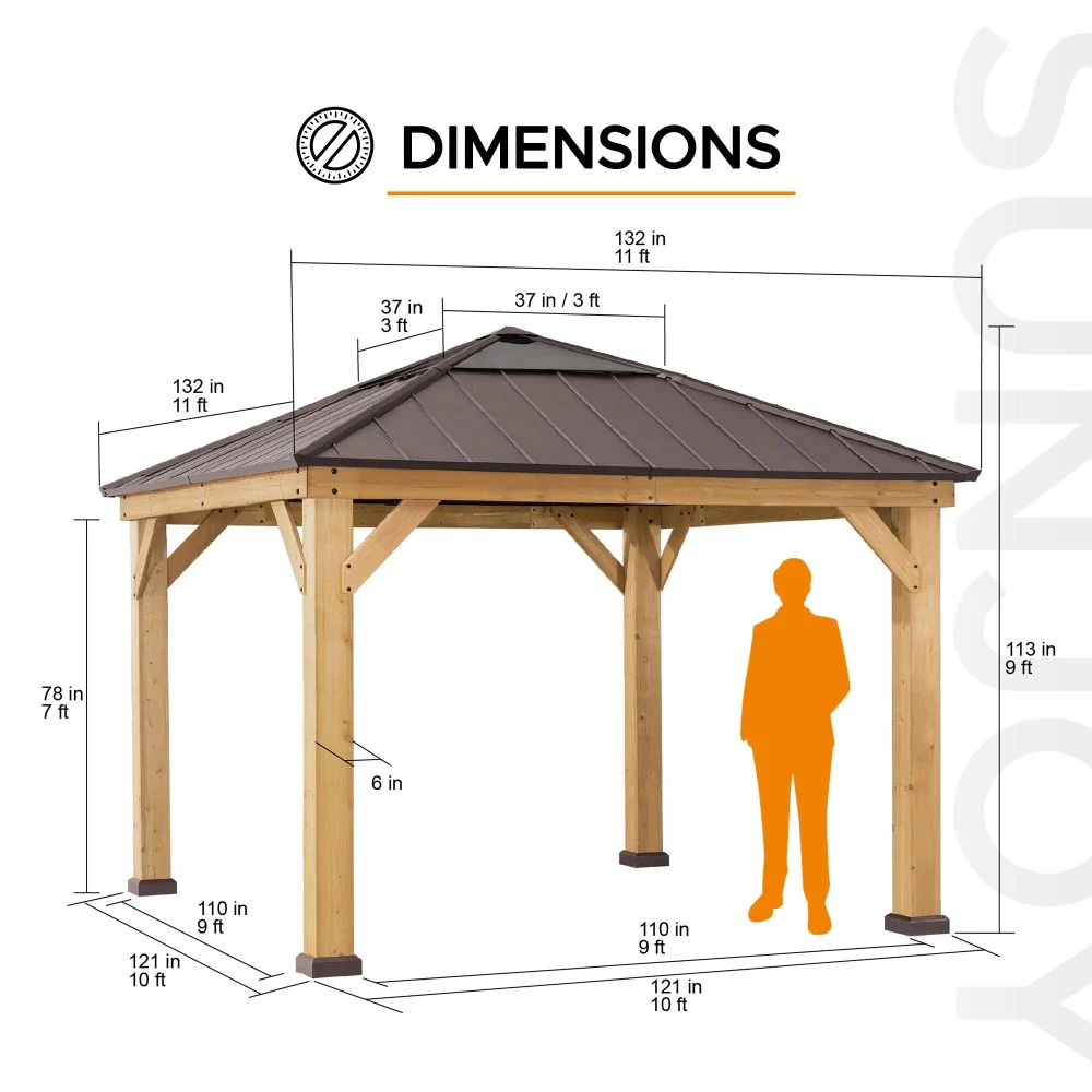 Expand your living space by bringing the indoors outside and creating your end-of-the-day oasis that’s the perfect spot for entertaining family and friends. This post-to-post size 10x10 gazebo by the world’s leading ready-to-assemble outdoor structure maker, Sunjoy, creates the perfect outdoor setting for any time of the year. Spend all four seasons enjoying a covered spot outdoors under the cedar wood frame with a sturdy powder-coated steel and polycarbonate rooftop that will stand the test of time. The polycarbonate skylight provides needed shade on hot sunny days while allowing in natural light. Set the mood by suspending a chandelier from the incorporated ceiling hook for additional functional light and high design. With straightforward, easy-to-follow assembly instructions you’ll be relaxing with your beverage of choice in your favorite new outdoor living space for years to come.